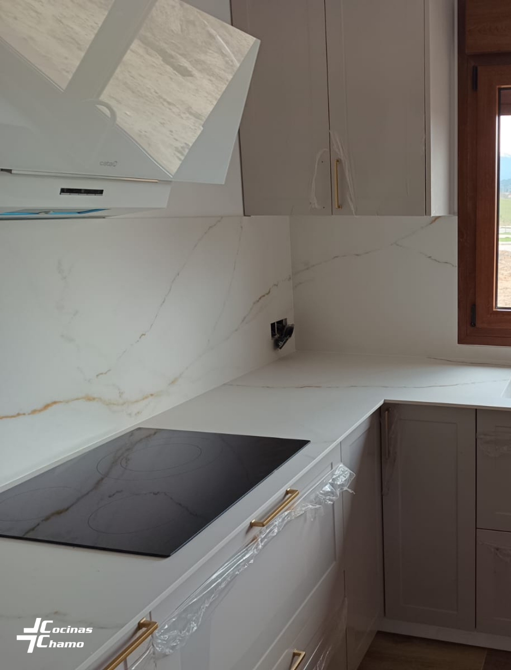 No solo elegimos el mejor material; perfeccionamos su acabado. Realizamos petos frontales a medida (forrado de pared) con el mismo material de la encimera. Esto elimina las juntas de azulejo, evita acumulaciones de grasa y crea una continuidad visual que hace tu cocina mucho más elegante y fácil de limpiar.