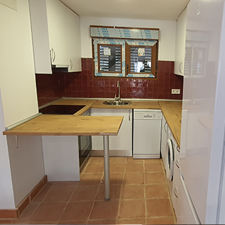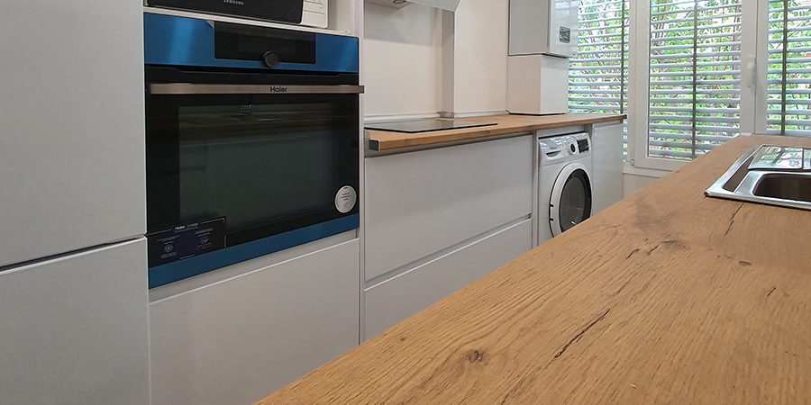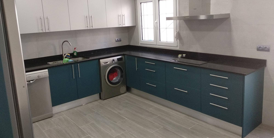 Encimera de Silestone Cocina con encimera de Silestone y puertas laminado efecto seda combinado gris claro y Verde aguamarina, mesa de cocina con cristal negro a juego con la encimera. Leer más...